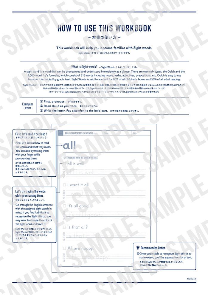 サイトワード(頻出単語で一目で見てわかるようにしておくべき単語集)のワークブックです。Pre-Primerからはじまり、Grade 3 まであります。単語シリーズの後に文章シリーズへ進むのがおすすめです。
